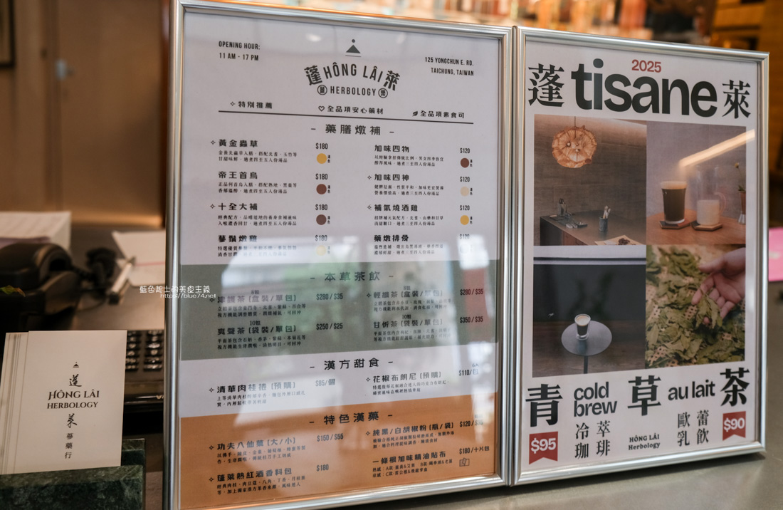 牆面上有刻有店名的匾額,出自台中老字號木雕店「陳彫刻處」,黑金配色很符合中藥行,旁邊還有蓬萊的台羅拼音Hông Lâi。