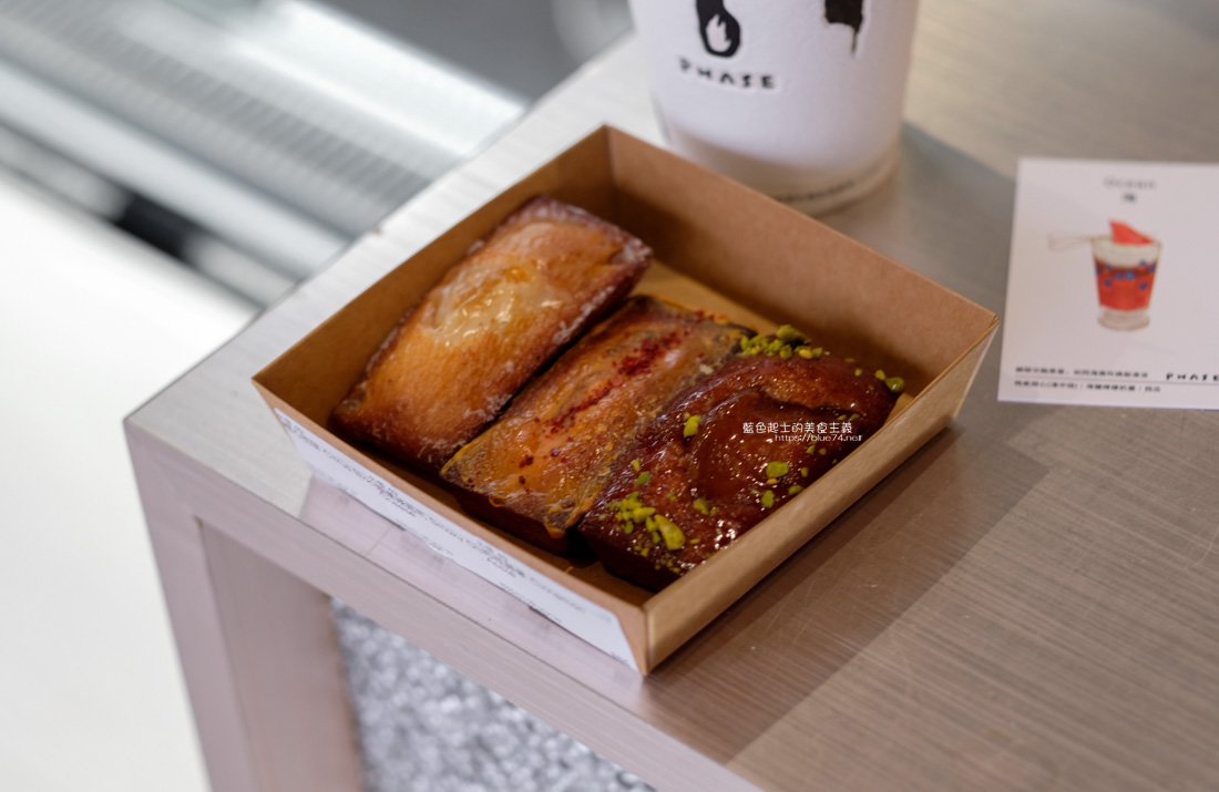PHASE二店,以外帶為主,空間不大,但營造的有質感,外帶足以,騎樓下有桌子可以立飲立食、拍照,供應7款特調咖啡和8款口味的費南雪,每天還有20款不一樣的咖啡豆,可以選擇做成美式或是拿鐵。