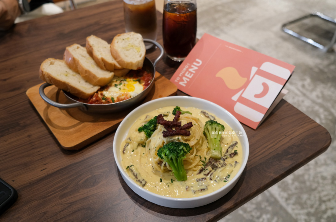 TO MORO明天,念起來跟TOMORROW很像,有諧音的趣味,一二樓的空間,規劃的好看,加入了橘色元素在其中,像是甜甜圈燈、好坐的椅子和立燈及門口,供應沙拉、早午餐、燉蛋和義大利麵。
