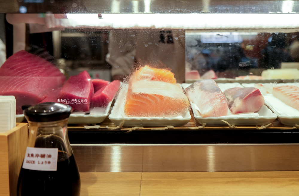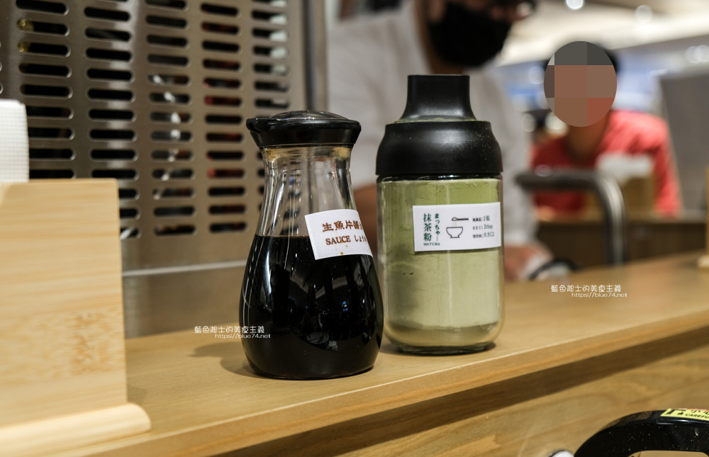 餐巾紙旁邊有生魚片醬油和抹茶粉,抹茶粉蓋子拿起來就是小湯匙的功用,座位的左右桌子兩邊前方都是按壓式出水熱水,跟連鎖的旋轉壽司一樣。