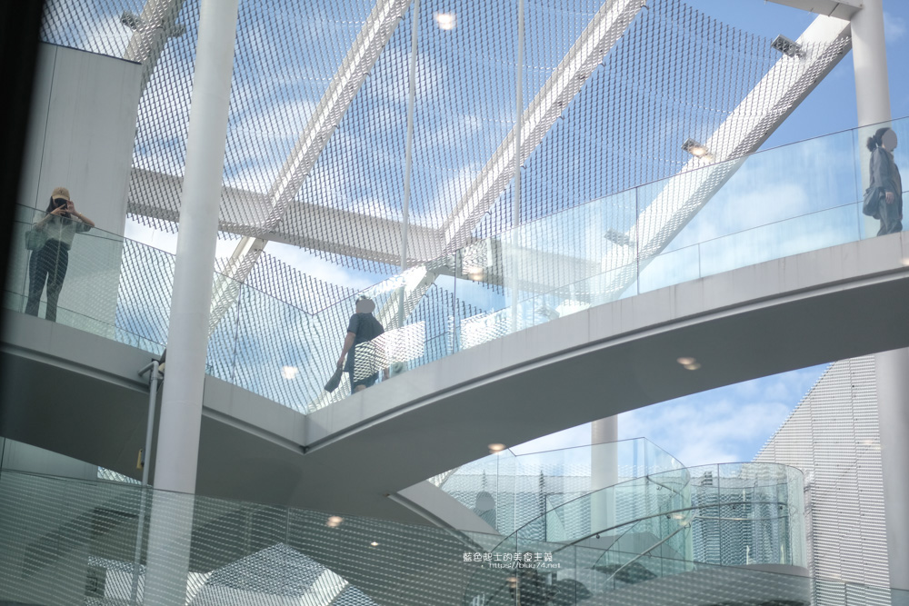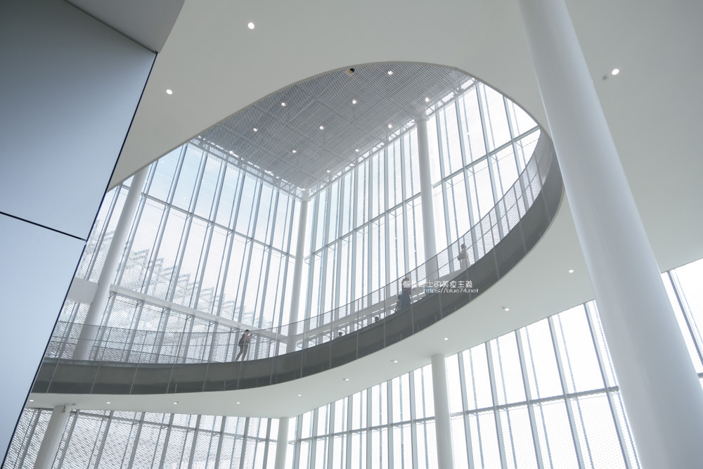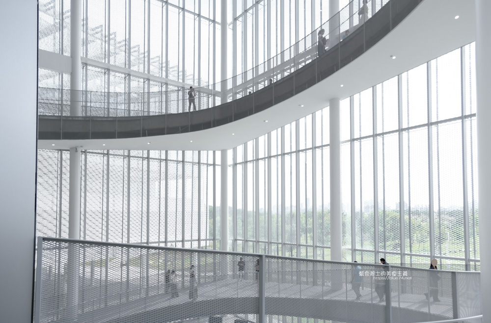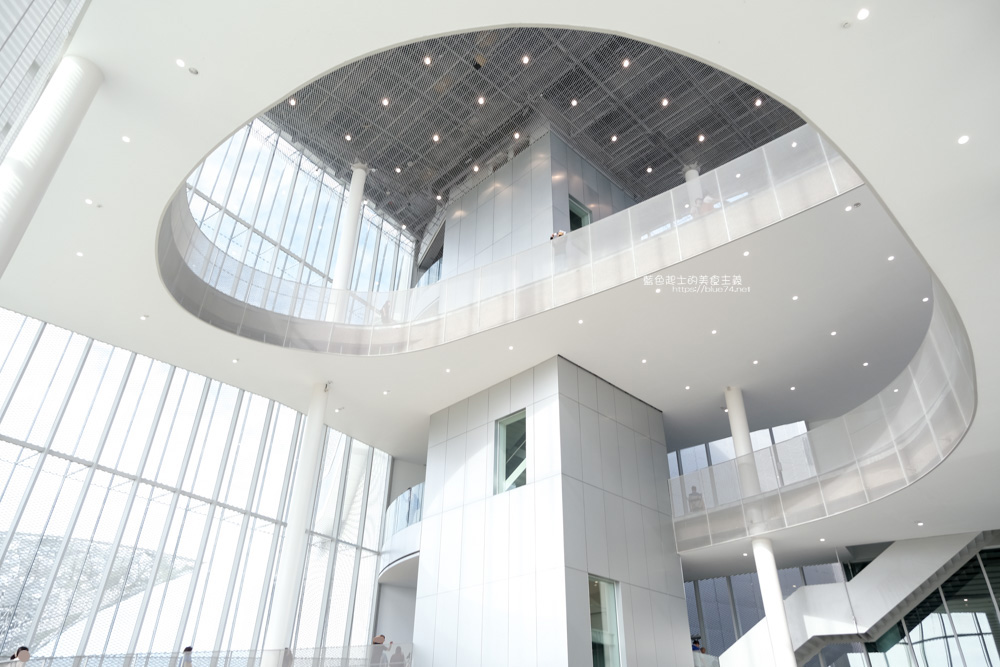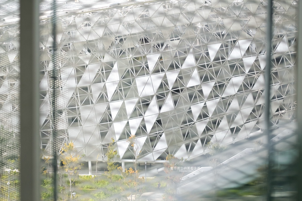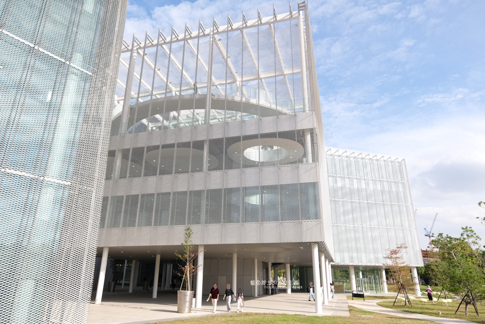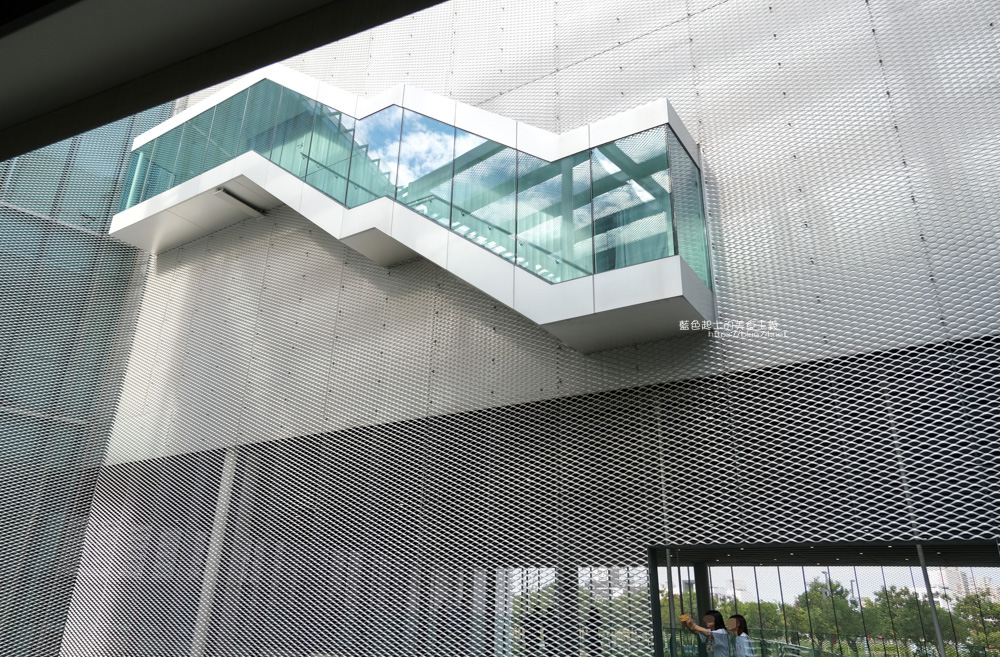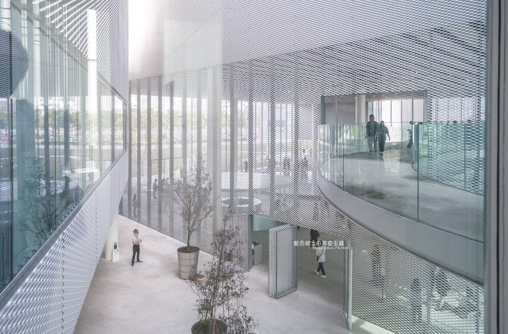 全台首座結合美術館與圖書館的場館的台中市綠美圖,自國際競圖起歷經11年籌建,終於迎來了試營運,由8座建築物組成的文化森林新地標,從大廳中央的不鏽鋼噴水池到挑高27尺的展示空間,還有戶外的屋頂花園等等,整棟建築非常通透,銀白色擴張網與玻璃帷幕可以看到外面的公園綠意和館跟館之間的視覺延伸性,真的很美。