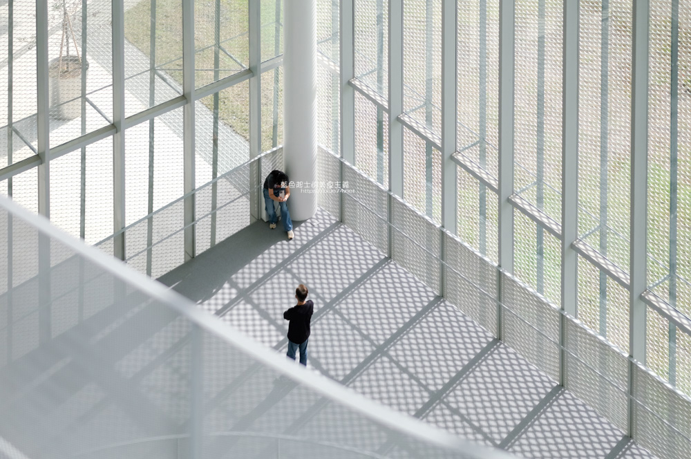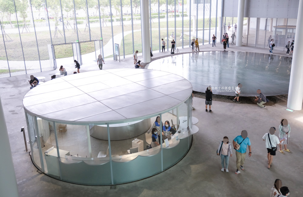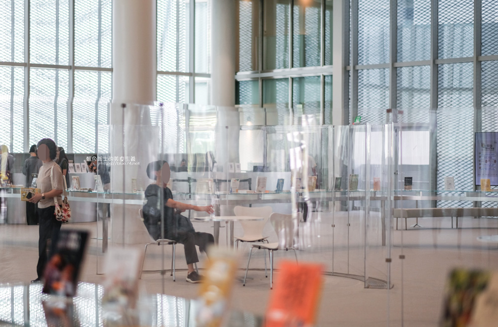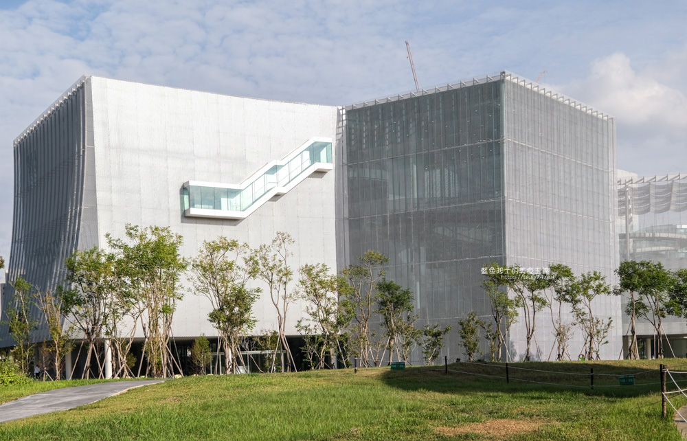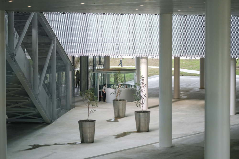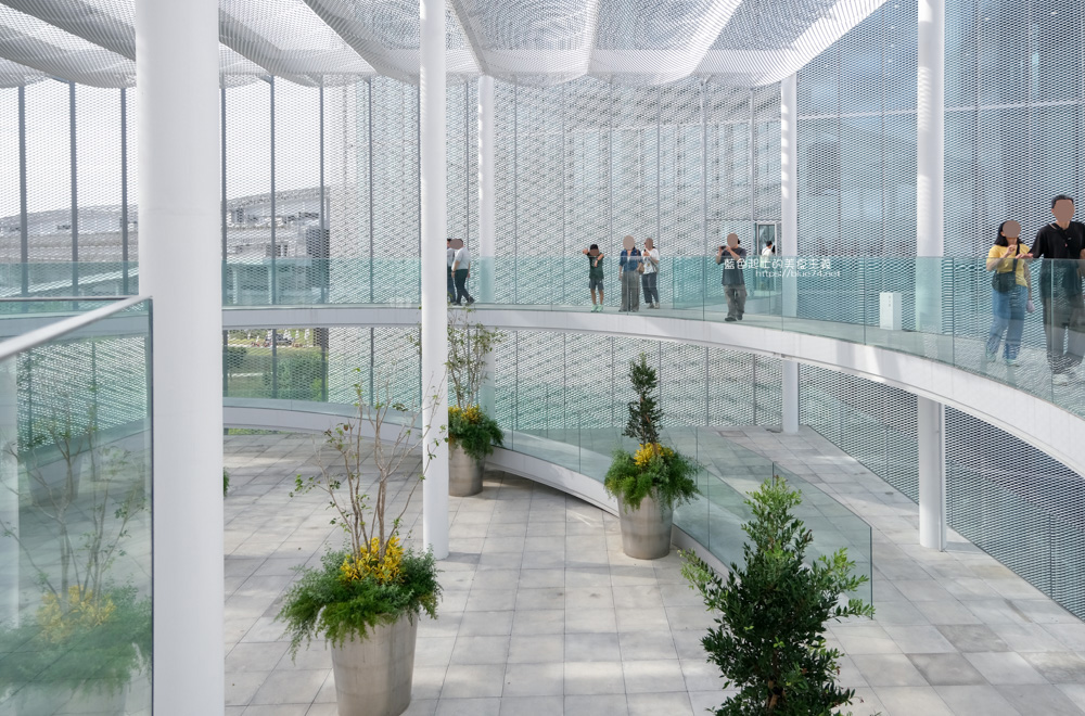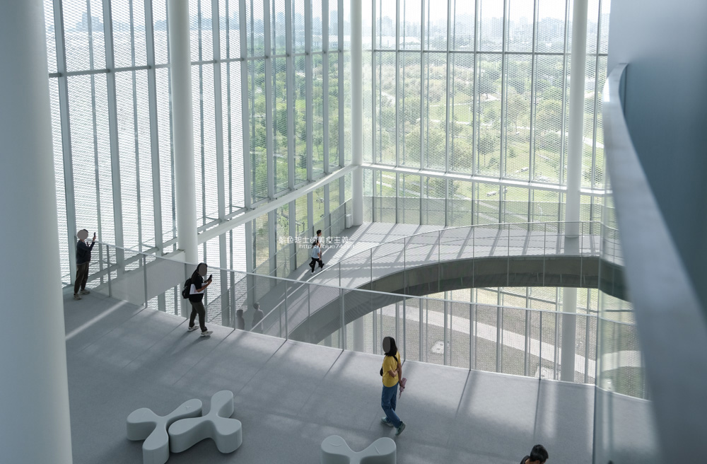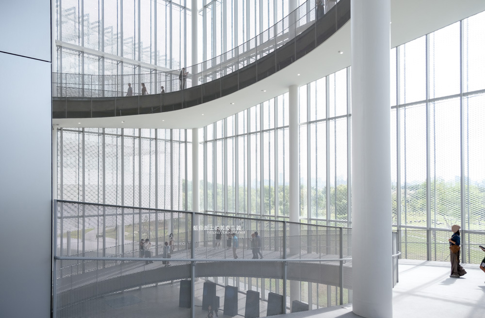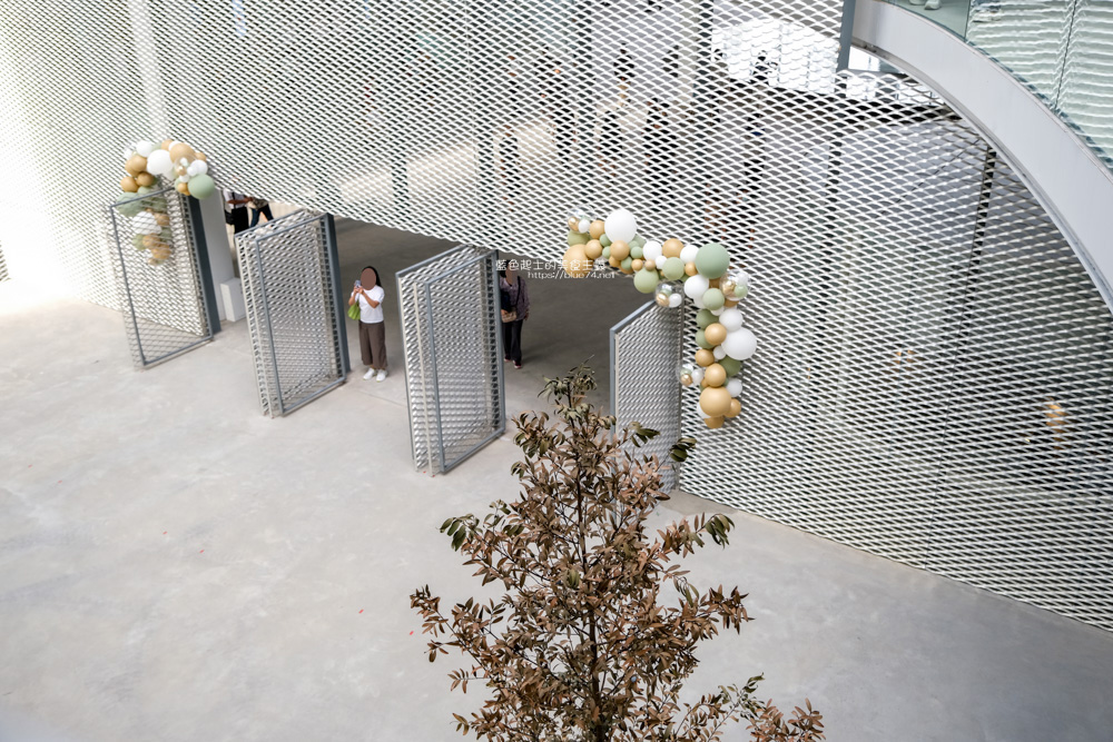 全台首座結合美術館與圖書館的場館的台中市綠美圖,自國際競圖起歷經11年籌建,終於迎來了試營運,由8座建築物組成的文化森林新地標,從大廳中央的不鏽鋼噴水池到挑高27尺的展示空間,還有戶外的屋頂花園等等,整棟建築非常通透,銀白色擴張網與玻璃帷幕可以看到外面的公園綠意和館跟館之間的視覺延伸性,真的很美。