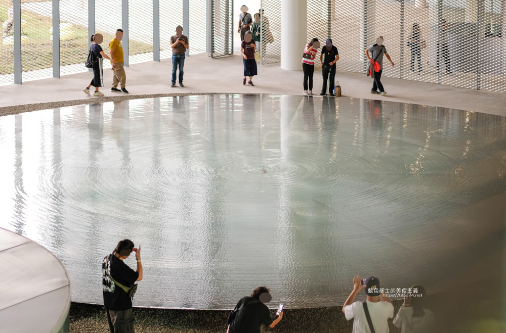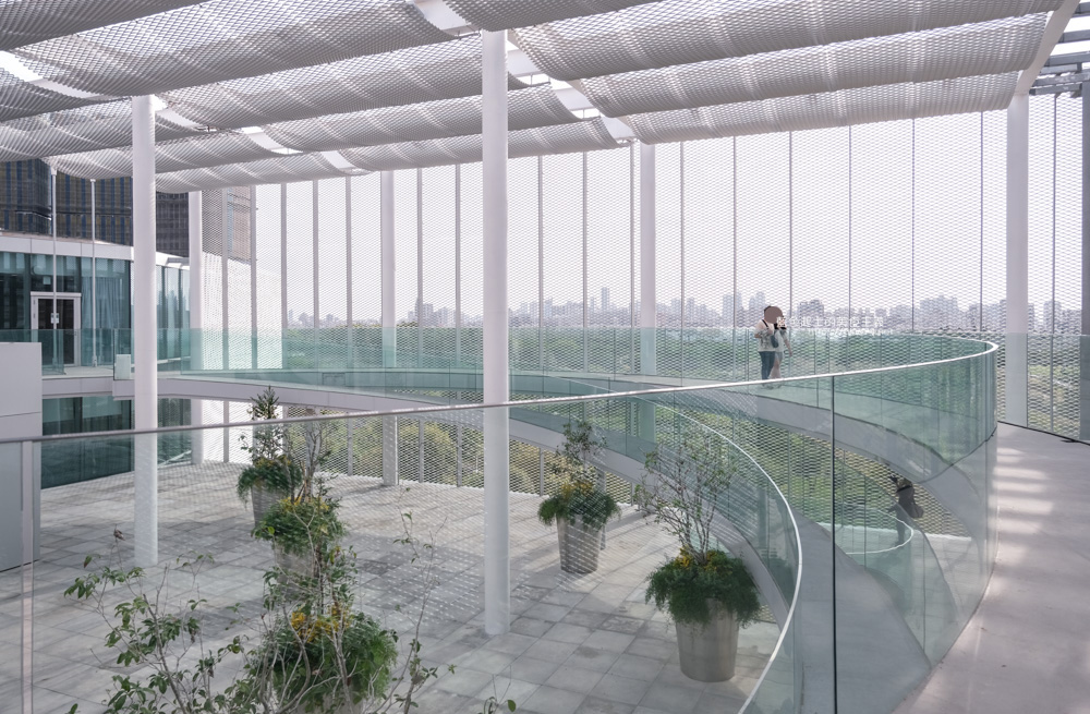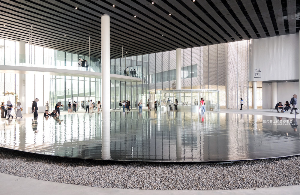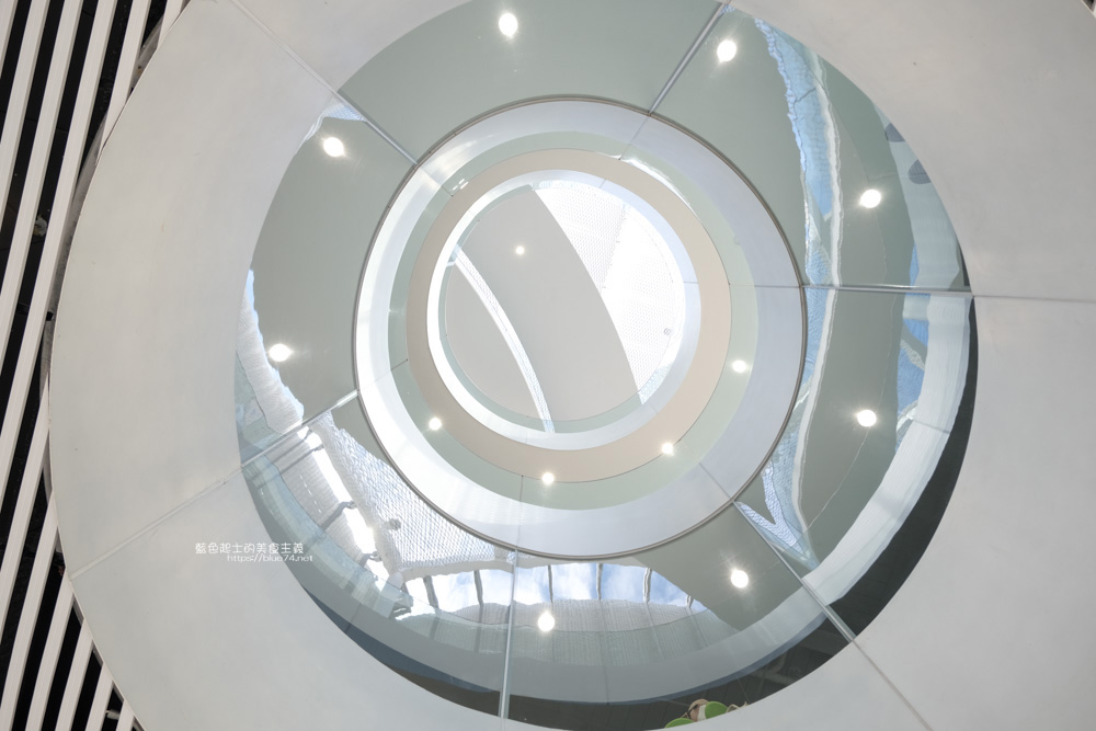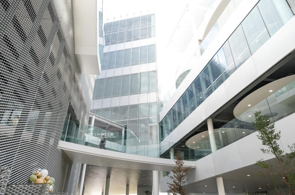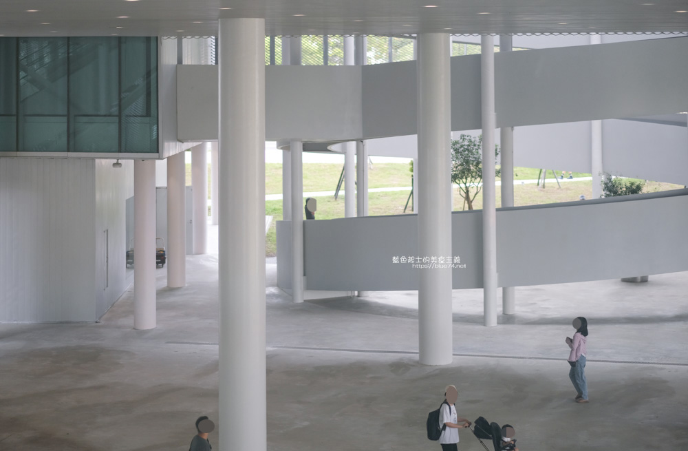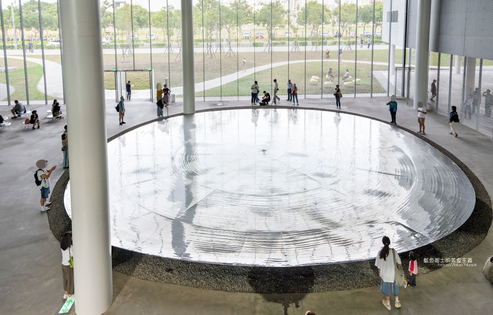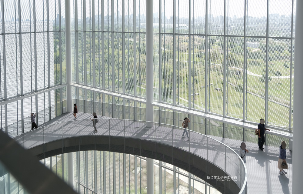全台首座結合美術館與圖書館的場館的台中市綠美圖,自國際競圖起歷經11年籌建,終於迎來了試營運,由8座建築物組成的文化森林新地標,從大廳中央的不鏽鋼噴水池到挑高27尺的展示空間,還有戶外的屋頂花園等等,整棟建築非常通透,銀白色擴張網與玻璃帷幕可以看到外面的公園綠意和館跟館之間的視覺延伸性,真的很美。